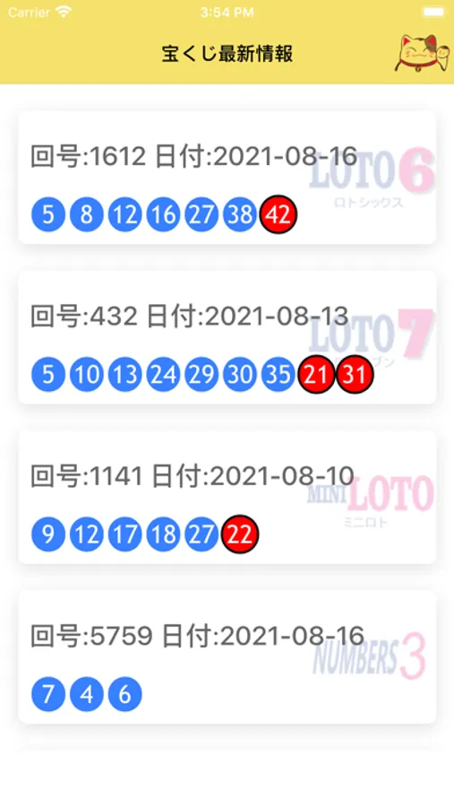 the best APP for the lottery fans to get the Japan lottery information. It let you quickly and easily check the latest lottery results of Loto7, Loto6, Mini Loto, Number3 and Number4.