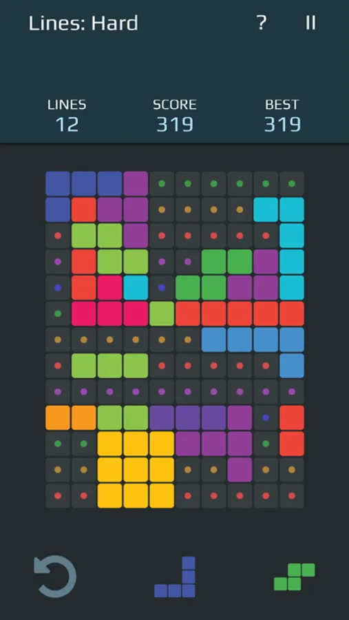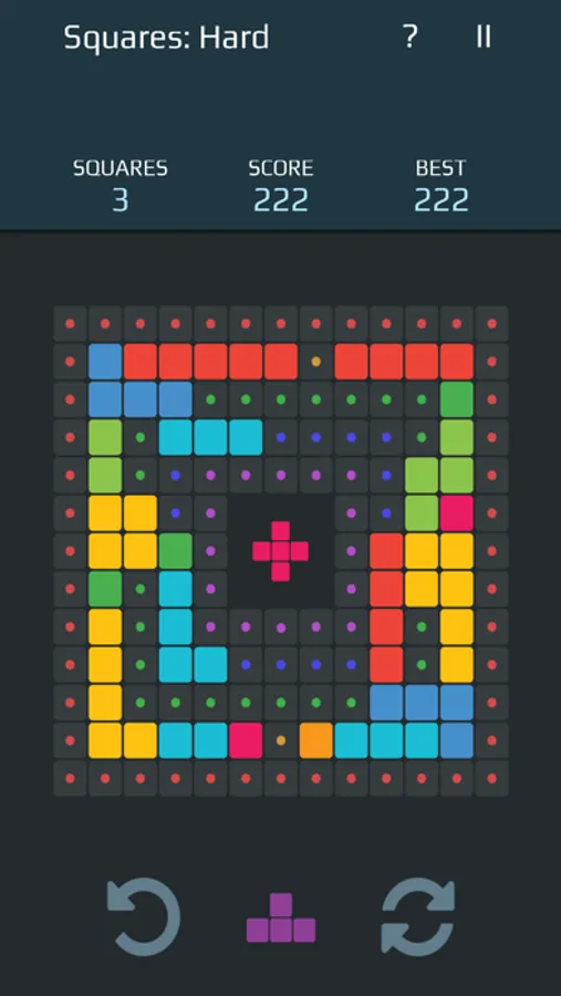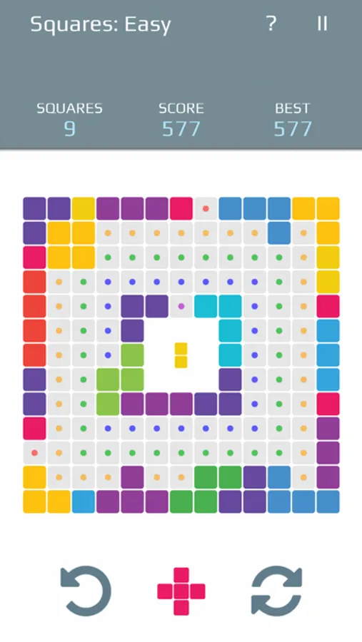 Place figures on game field to fill the places marked with the same color (squares). When you fill a square it is erased to make space for new figures, and you earn score points. Erasing the large squares gives more points. The game continues until there is a space to put the next figure. Made wrong move? The last move can be canceled unless it led to the erasing of a square.