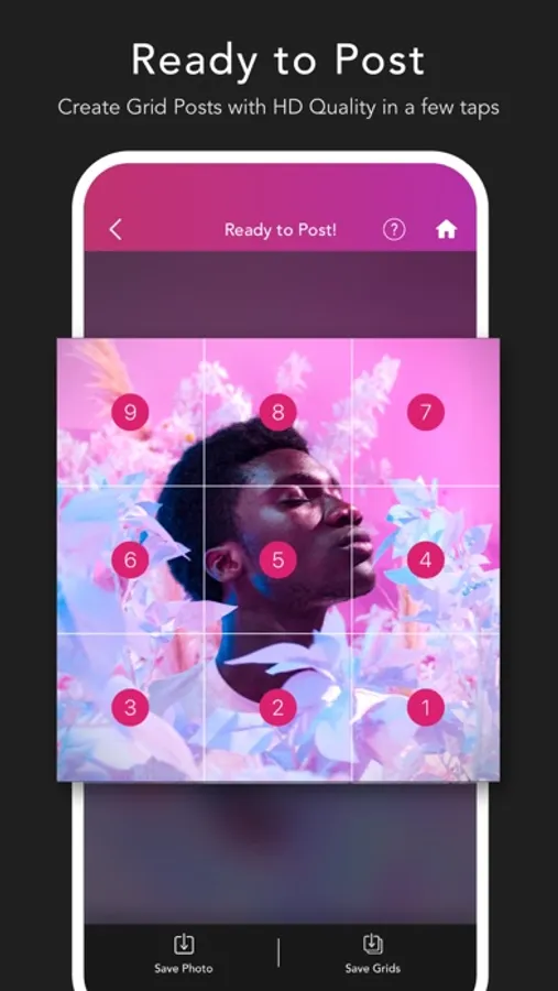 • Grid Post: split your photo into any Grid Layouts up to 10 rows using Grid Preset selection by tapping on [+]. You can also quickly select a predefined grid layout (1x3, 2x3, 3x3, 4x3) for your photo by tapping on the number button on the top.