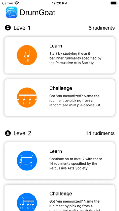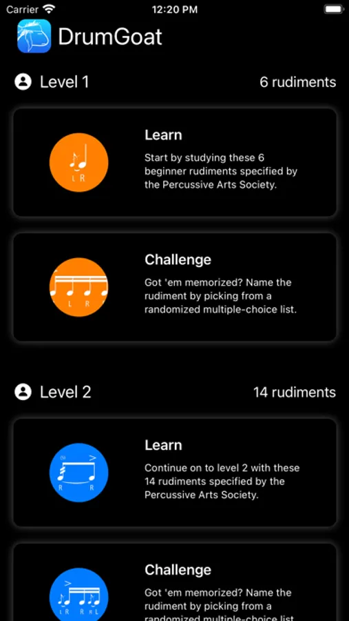DrumGoat helps drummers by challenging and reinforcing the audio-visual memory of rudiments - the “alphabet” of drumming - while making it simple, fun and fast.
