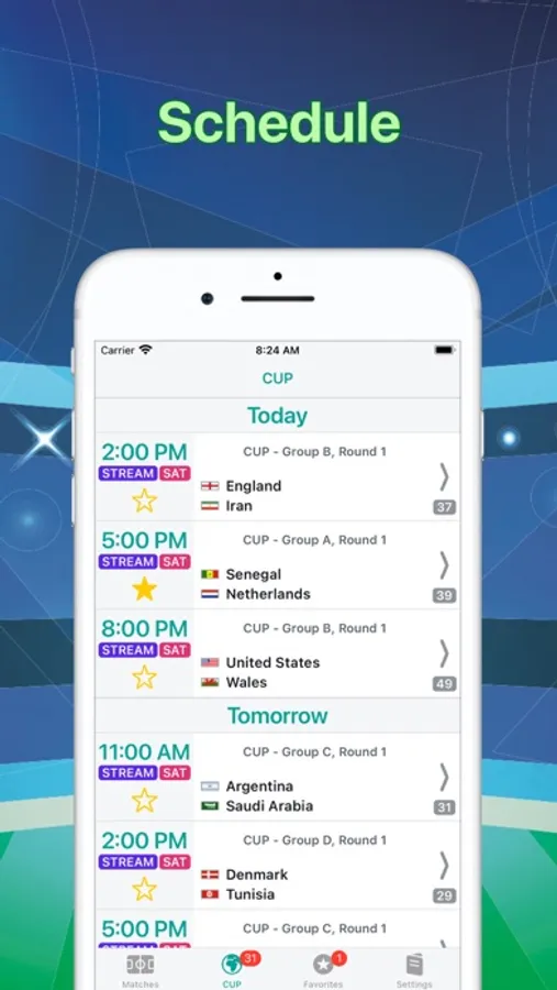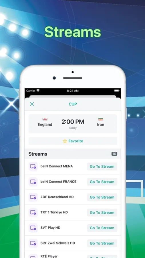 TV program schedule for football matches on satellite TV and streams with the ability to set reminders for matches that you want to watch. For each match this kind of information is available: