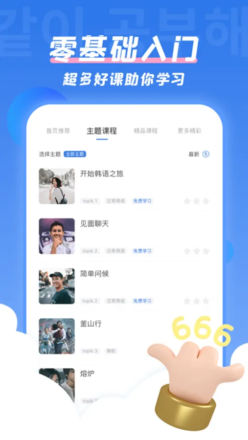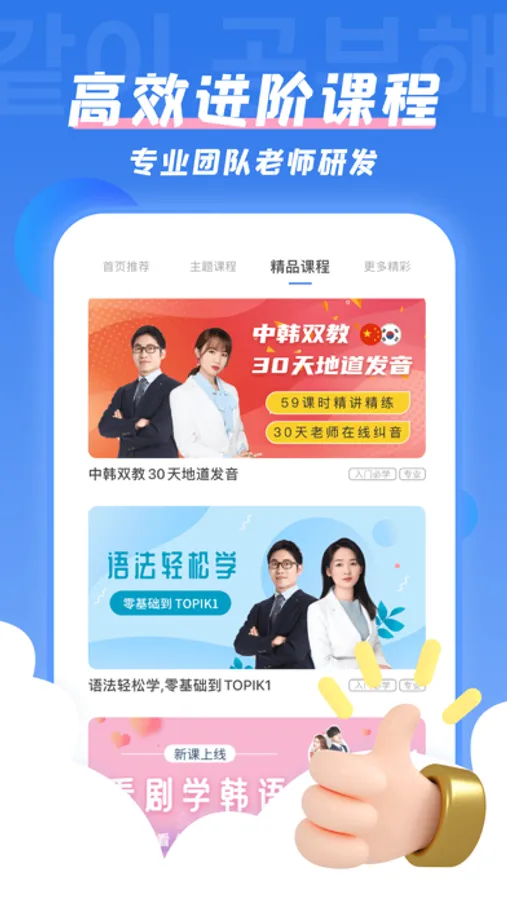 精编各类专题课程,热门韩国综艺和经典韩剧,从词到句,闯关式趣味学习