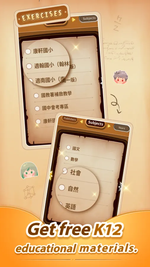 Provide Taiwanese K12 students with free, latest educational materials from 5 subjects (Chinese, English, Mathematics, Social Studies, Science) to answer question and practice!
