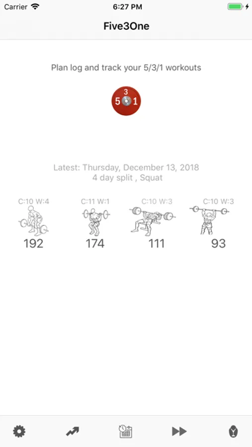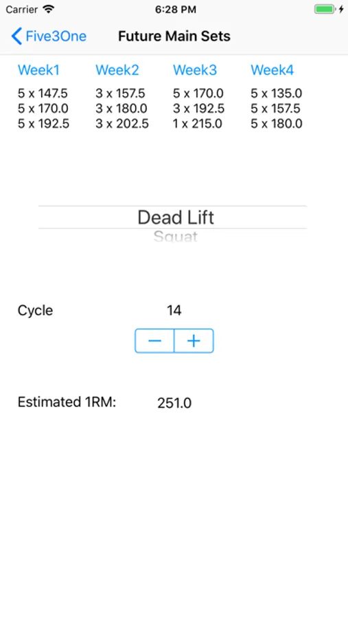 Enter your current 1 rep max and the app will calculate and manage your Jim Wendler's 5/3/1 progression and workout program.