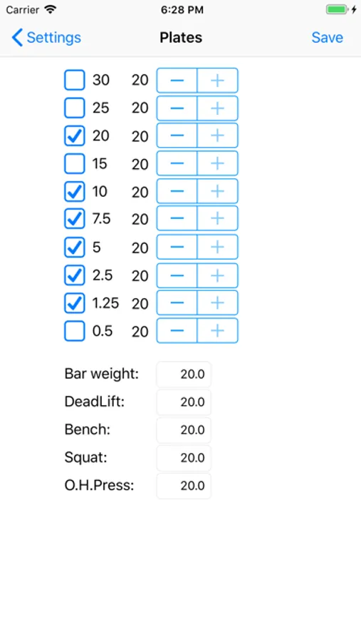 - Configurable bar weights for the main lifts
