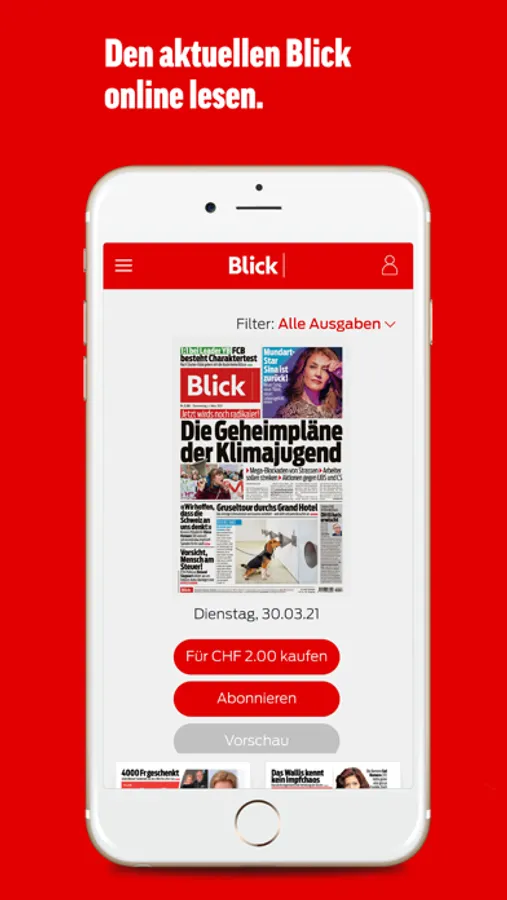 Frische News aus erster Hand, jederzeit und überall griffbereit. Seien Sie bestens von Montag bis Samstag informiert. Die stärksten News und die aktuellsten Sportnachrichten mit den spektakulärsten Bildern finden Sie in unserem Blick E-Paper. Der App-Download ist für Sie kostenlos. Um Inhalte anschauen zu können, müssen Sie jedoch ein kostenpflichtiges Abo abschliessen oder einzelne Ausgaben kaufen.