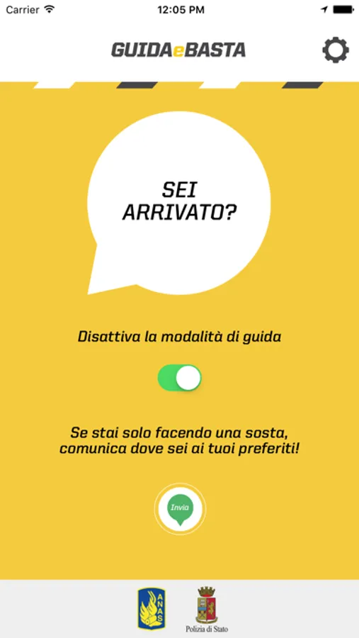 La prima volta che utilizzi GUIDAeBASTA dovrai creare una lista delle persone a te più care. Poi, ogni volta che vorrai, ti basterà attivare la modalità di guida dell’App per concentrarti solo sulla guida. L’App ti permetterà di inviare in automatico un messaggio ai tuoi preferiti per comunicare loro la durata stimata del tuo viaggio. Una volta arrivato puoi disattivare la modalità viaggio semplicemente. Se invece ti fermi per una sosta puoi inviare ai tuoi preferiti la tua posizione, con un solo tap.
