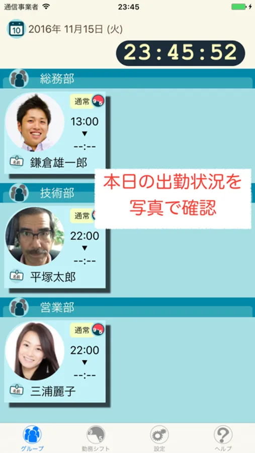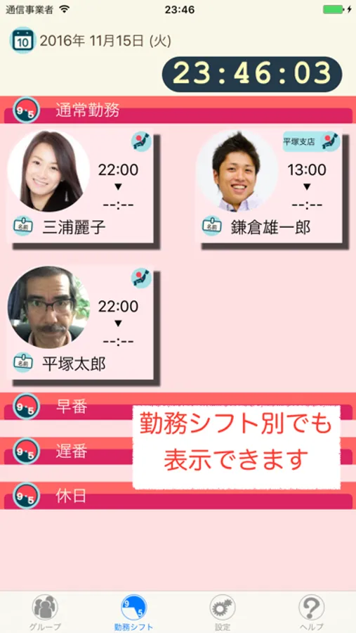 ・一覧画面は”グループごと”と”勤務シフトごと”を選んで表示できます。