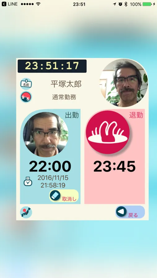 ・タイムカード:出勤(業務開始)時刻と退勤(業務終了)時刻の登録は、名前を押すと表示される登録画面で