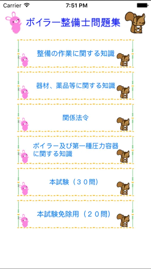 各科目から5問又は10問づつ出題され全30問で学習できます。また問題はその都度ランダムなため、何度でも試すことができます。