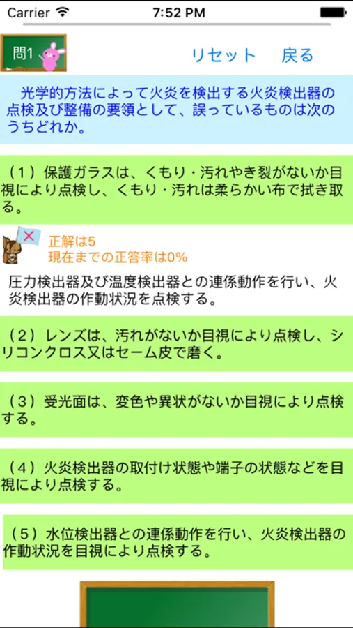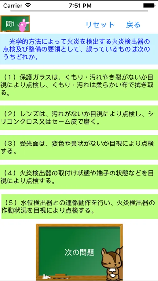 自動で間違えた問題を記憶し、間違えた問題、まだ解いていない問題を優先的に出題します。またセーブ機能がついているため、途中でやめても再度立ち上げた時に続きから問題を解くことができるので、効率よく勉強をすすめることができます(データは各科目ごとにmenuボタンからリセットすることができます)