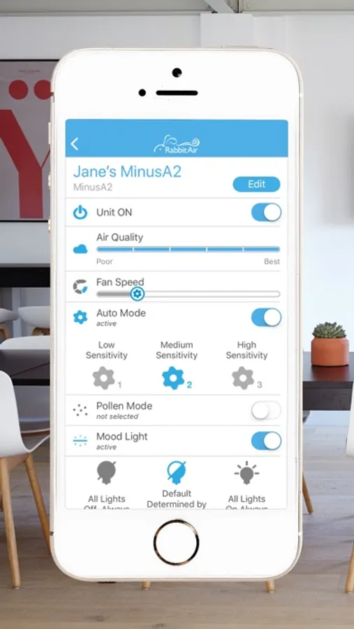 Keep an eye on the air quality in your house and settings on your device, even when you’re away.