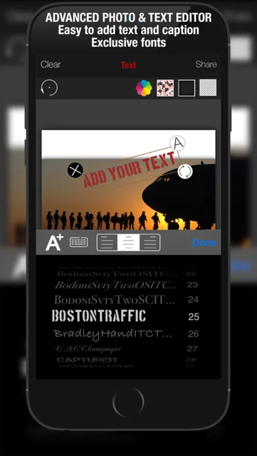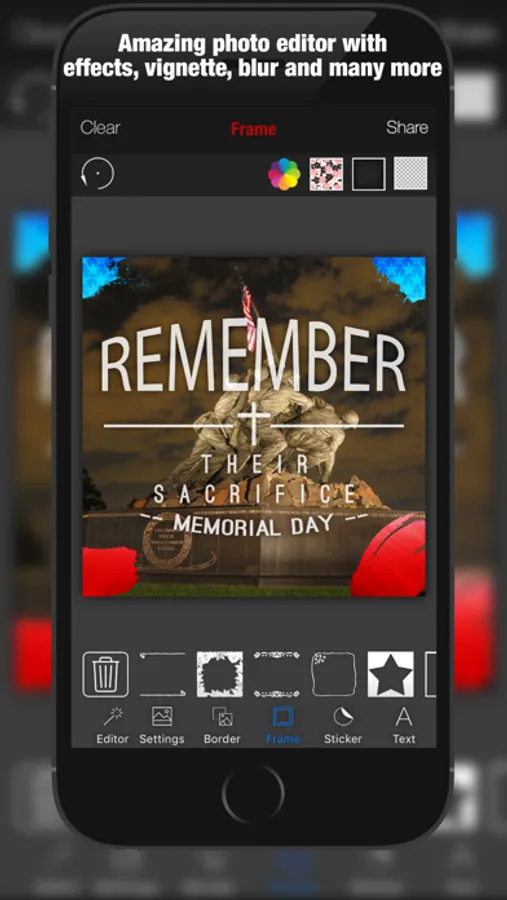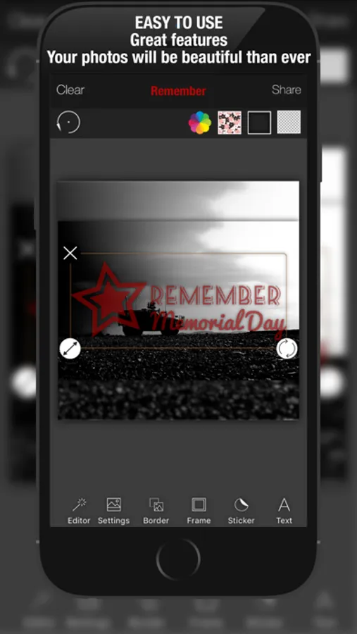 » You can add your own textures even your own photo and you can use them as border, frame, text, sticker texture.