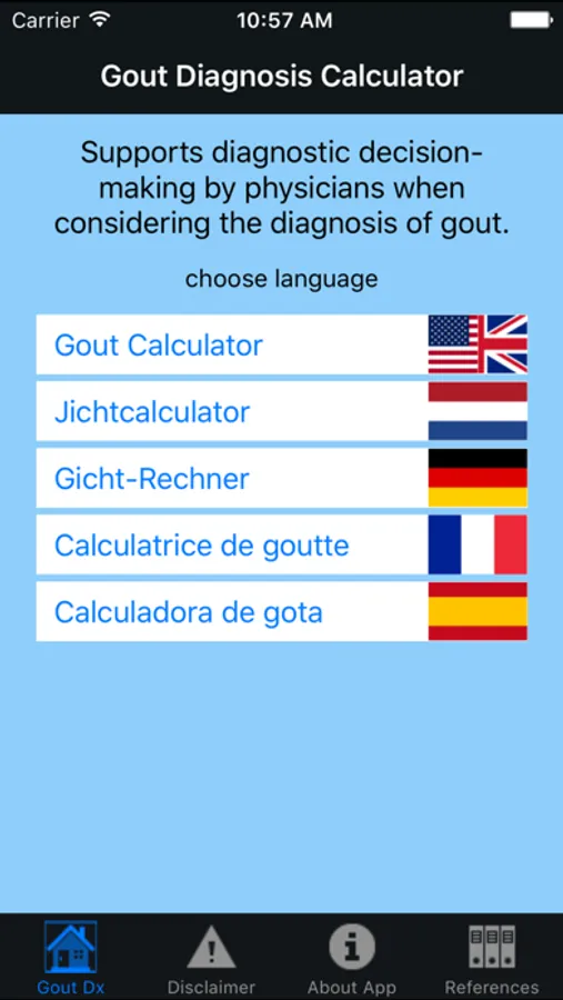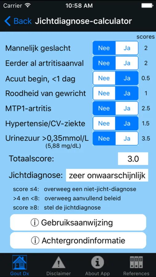 Gout is a tricky diagnosis to make. Rarely is it made via the gold standard technique of synovial aspiration and polarized light microscopy. The vast majority of diagnoses are clinical. A primary care and rheumatologist team of Dutch researchers led by Hein Janssens derived and published a clinical decision rule in 2010. This app brings that decision rule to primary care physicians, rheumatologists, and acute care (ER/urgent-care) clinicians everywhere. With just a few clicks of information about a patient's case, you can see what the gout diagnosis calculator suggests about the patient's chances of having gout or not having gout. The app is a collaboration by Dr. Joshua Steinberg and Dr. Hein Janssens, both family physicians. The first version offers English and Dutch versions. Updates coming soon will offer German, French, and Spanish versions. The app also contains educational background information about the diagnosis of gout in general and about how the gout diagnostic rule and calculator were developed and later validated. Full references to the literature are provided including links to Pub Med.
