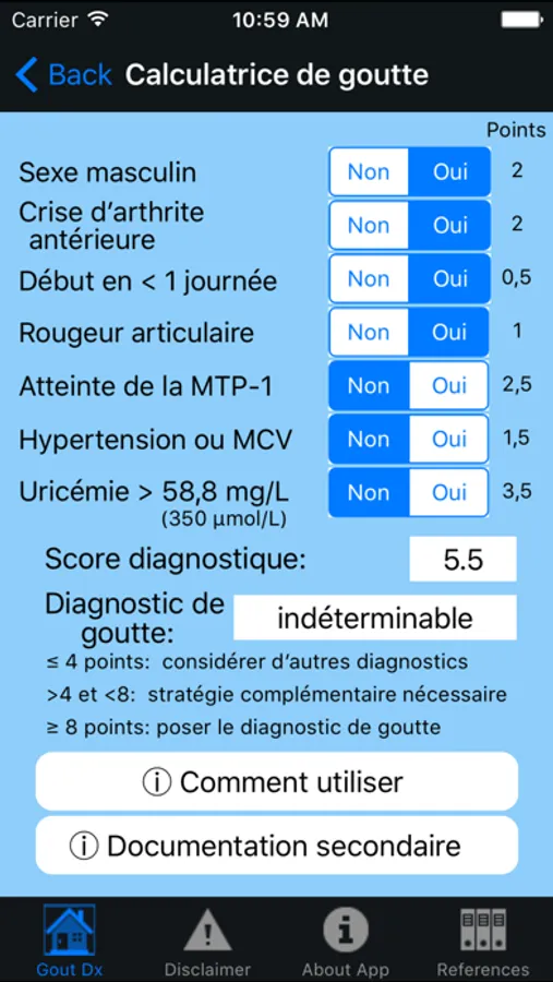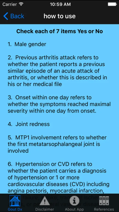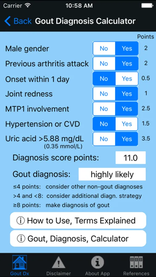 Like all my apps, this app is intended for clinicians only, not the lay public. It is written to help family physicians, internists, general practitioners, rheumatologists, residents, and students consider the diagnosis of gout in those who present with acute mono-arthritis.