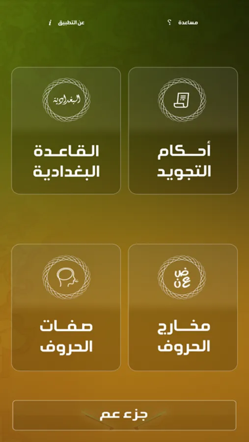 يحتوي التطبيق على عرض جزء عم ملوناً، تطبيقاً على طريقة تلاوة القرآن الكريم بأحكام تجويد القرآن الكريم من خلال استخدام الألوان