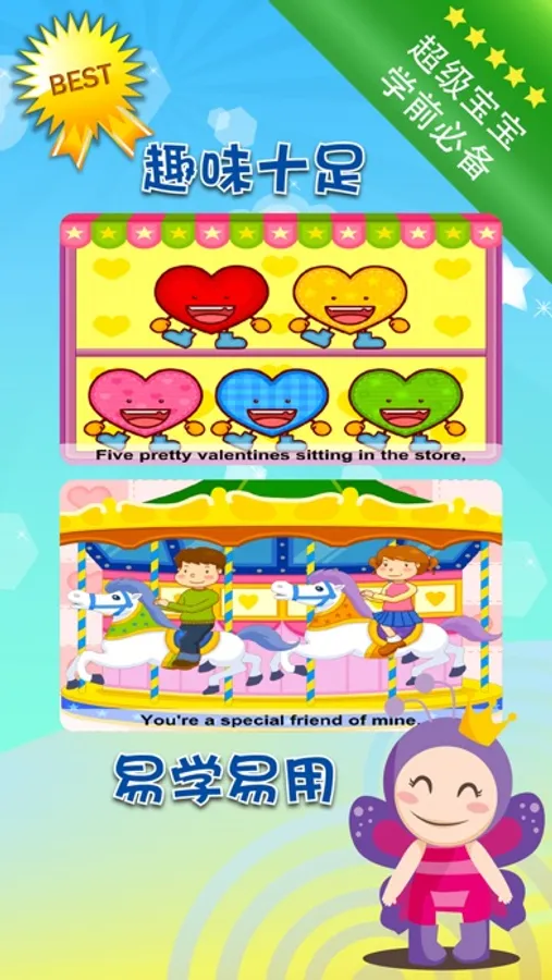 伴着悦耳动听的旋律,活泼的童声,为孩子们学唱英文儿歌营造了良好的学习氛围,沉浸在音乐的世界里,让孩子的心灵与音乐共振,心智与音乐共鸣。标准清晰的英语发音,欢欣节奏,在倾听音符的同时,让孩子们在快乐的音乐环境中学习英文,是一份送给孩子们不可多得的礼物。旋律优美动听,悦耳的歌声,欢快的节奏,在欢声笑语中令孩子享受学习英语的乐趣。心听巧学,理性学识,释放潜能,强化启蒙,开启宝宝智慧的金钥匙。