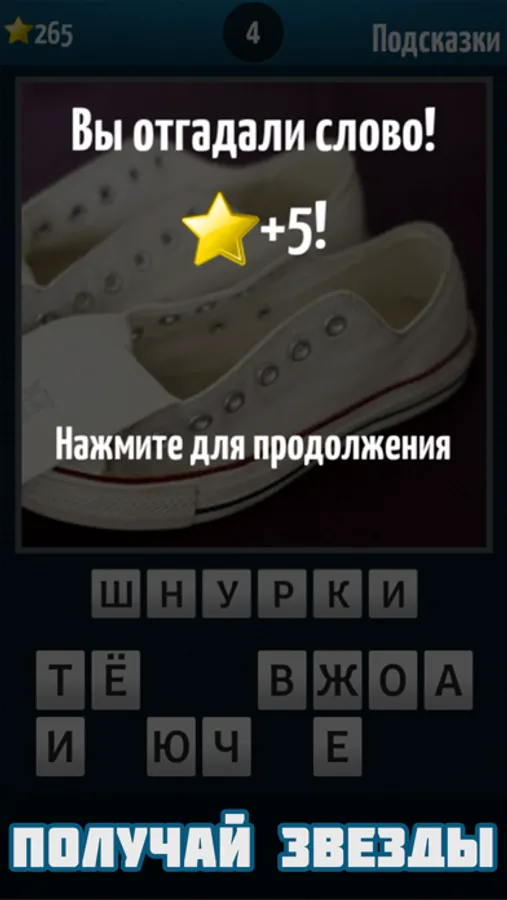 А две доступные подсказки - открыть любую букву или убрать все лишние буквы - помогут пройти уровни, если вы испытаете затруднение с ответом.