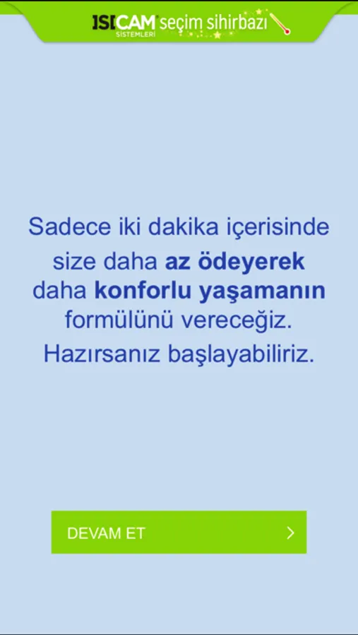 Isıcam Seçim Sihirbazı uygulaması ile birkaç basit soruya cevap vererek oturduğunuz bölgeye ve ihtiyaçlarınıza en uygun Isıcam ürününü seçebilir, size en yakın Isıcam Yetili Üreticisine ulaşarak Isıcam’larınızı temin edebilir, bize ulaşın bölümüyle konusunda uzman teknik personellerimize her türlü soru ve sorununuzu ileterek destek alabilirsiniz.