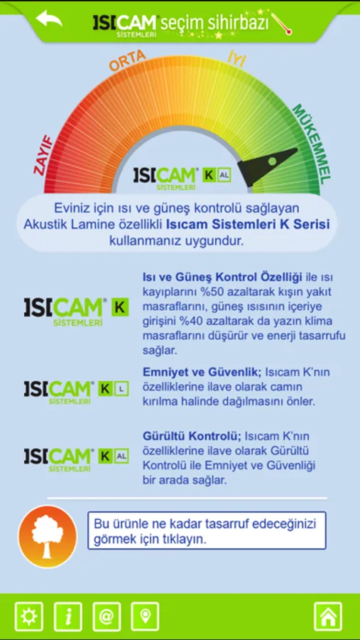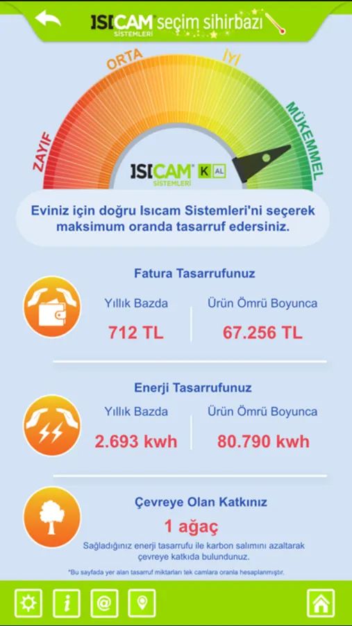 Lütfen tasarruf hesaplayıcısı ile Isıcam ürünleri kullanarak yaptığınız enerji tasarrufu ile hem bütçenize hem de ülkemize ve çevreye olan katkılarınıza da göz atmayı unutmayın.