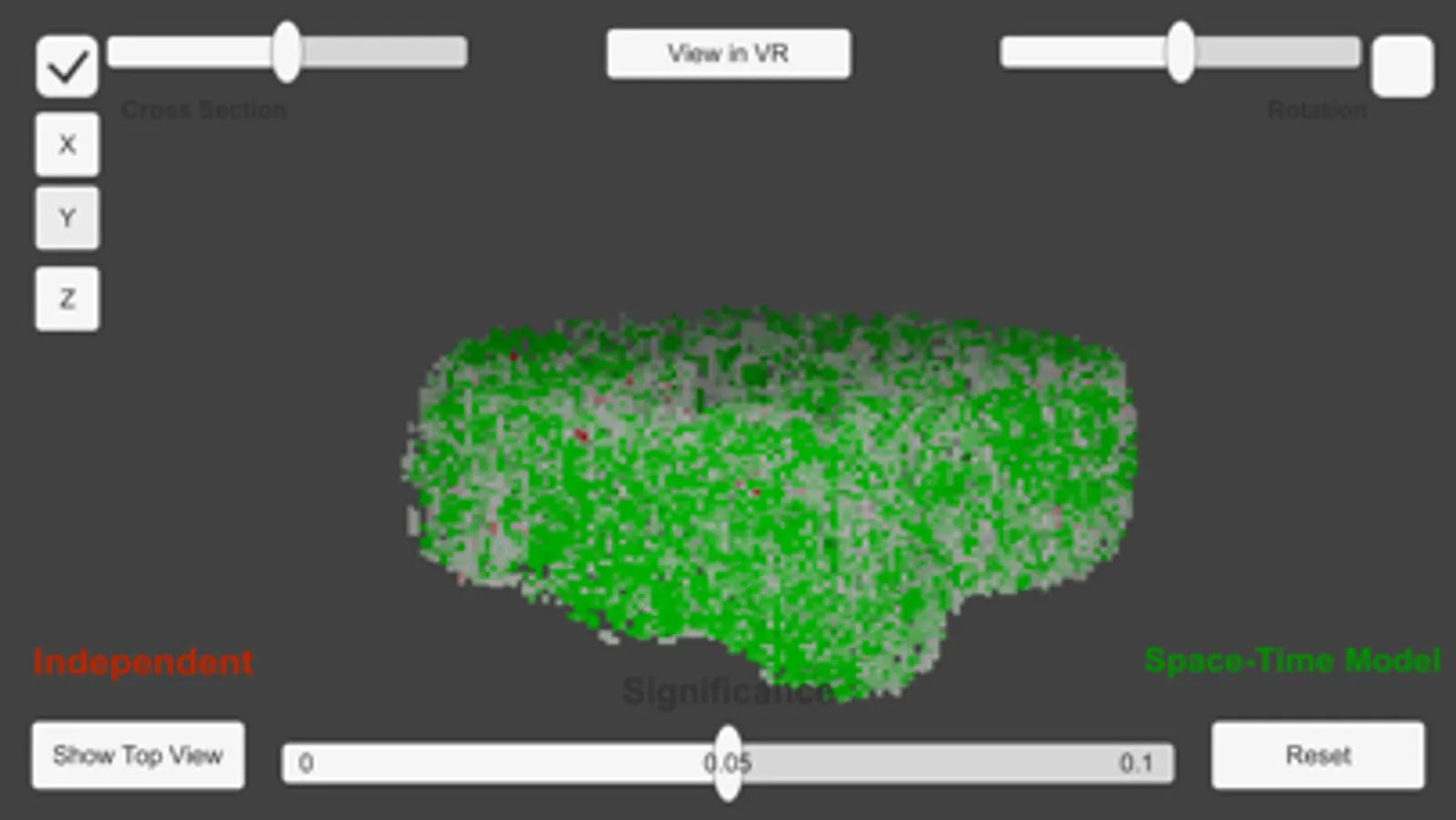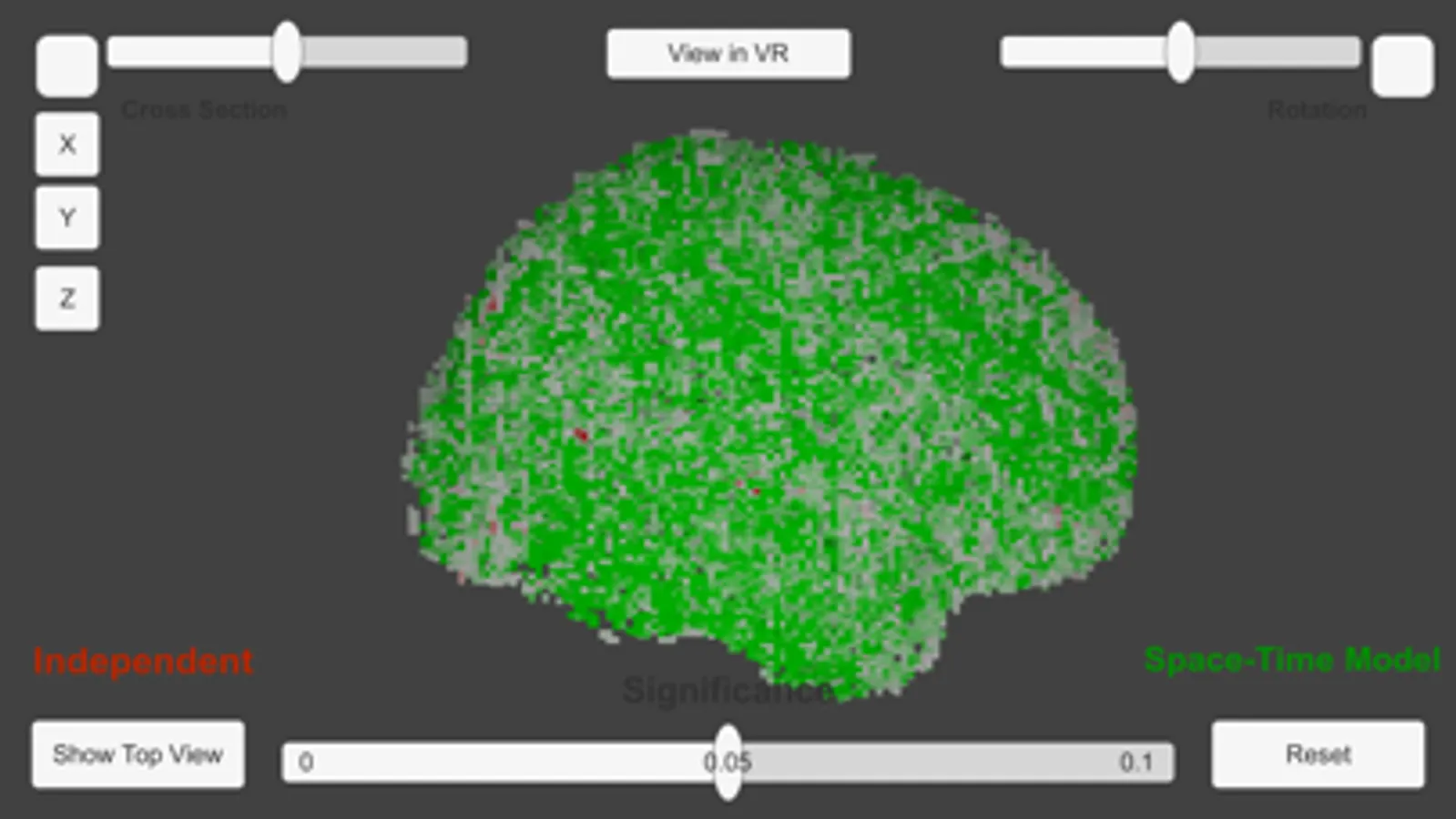 The app provides an interactive approach to visualize which areas of the brain are active in a subject that is performing a motor task. The differences between two p-value data sets are shown, one data set shows activated areas according to a traditional approach ("Independent"), and one with a new method proposed by scientists at KAUST and Newcastle University ("Space Time Model").