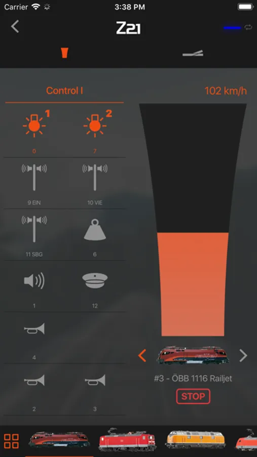 Model train control was never this easy and convenient: With one swipe of your hand you can scroll to your model of choice in the locomotive library. A slight touch on the headlight symbol and the front and backlights go on. A second touch, this time on the speaker symbol, and the locomotive makes a sound. Drag your finger over the speed indicator and the train accelerates.