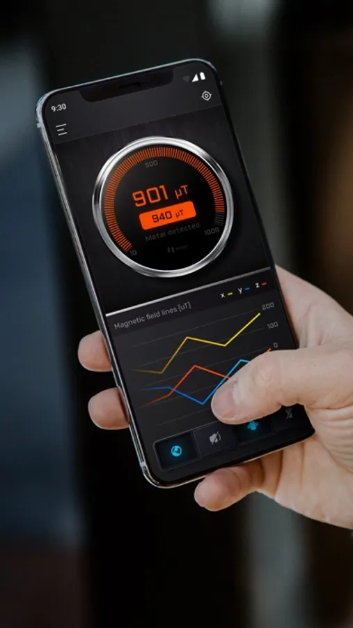 The usage is simple: launch this app on your mobile device and move it around. You will see that the magnetic field level shown on the screen is constantly fluctuating. Colorful lines represent the three dimensions and the numbers on top show the value of the magnetic field level (EMF). The chart will increase, and the device will vibrate and make sounds, announcing that the metal is close. You can change the sensitivity of vibration and sound effects in the settings.