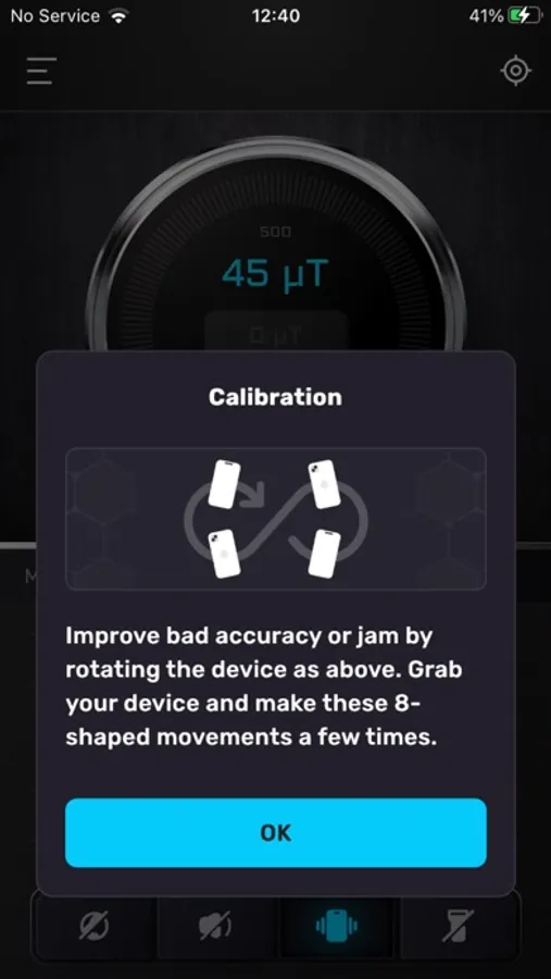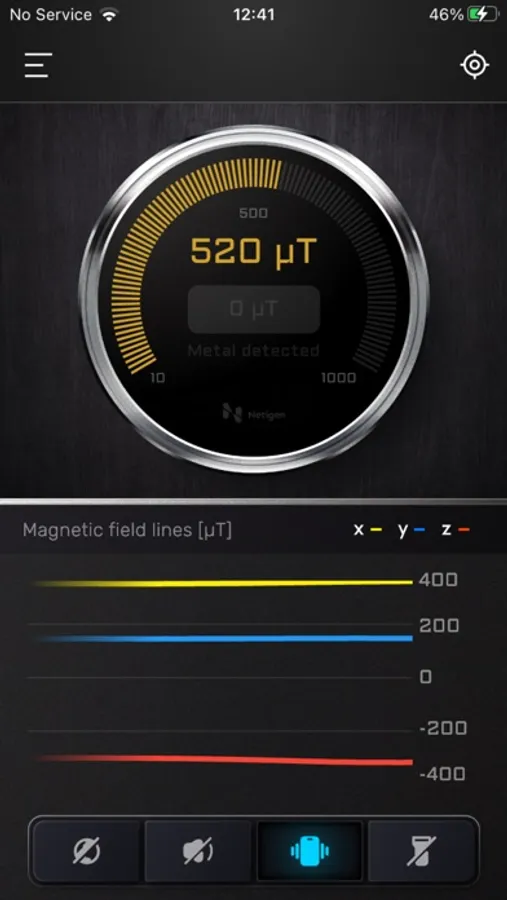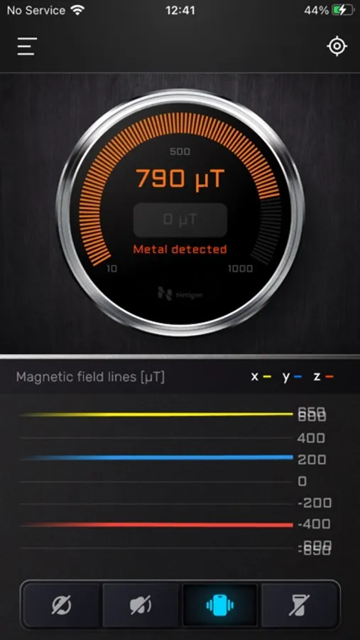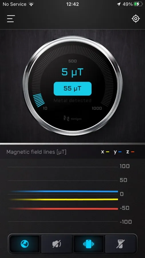 Metal Detector is an iOS application that detects the presence of metal nearby by measuring the magnetic field value. This useful tool uses the magnetic sensor built into your mobile device and shows the magnetic field level in μT (microtesla). The magnetic field level (EMF) in nature is about 49 μT (microtesla) or 490 mG (milligauss); 1 μT = 10 mG. If any metal is nearby, the value of the magnetic field will increase.