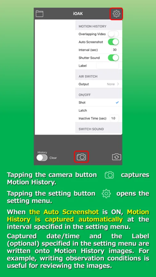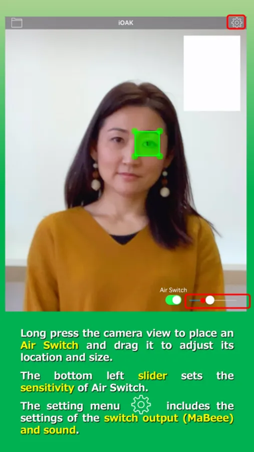 Draw rectangles on the camera screen as non-contact switches which can be activated by the movement within the areas. Air Switches can control battery type wireless switch, MaBeee.