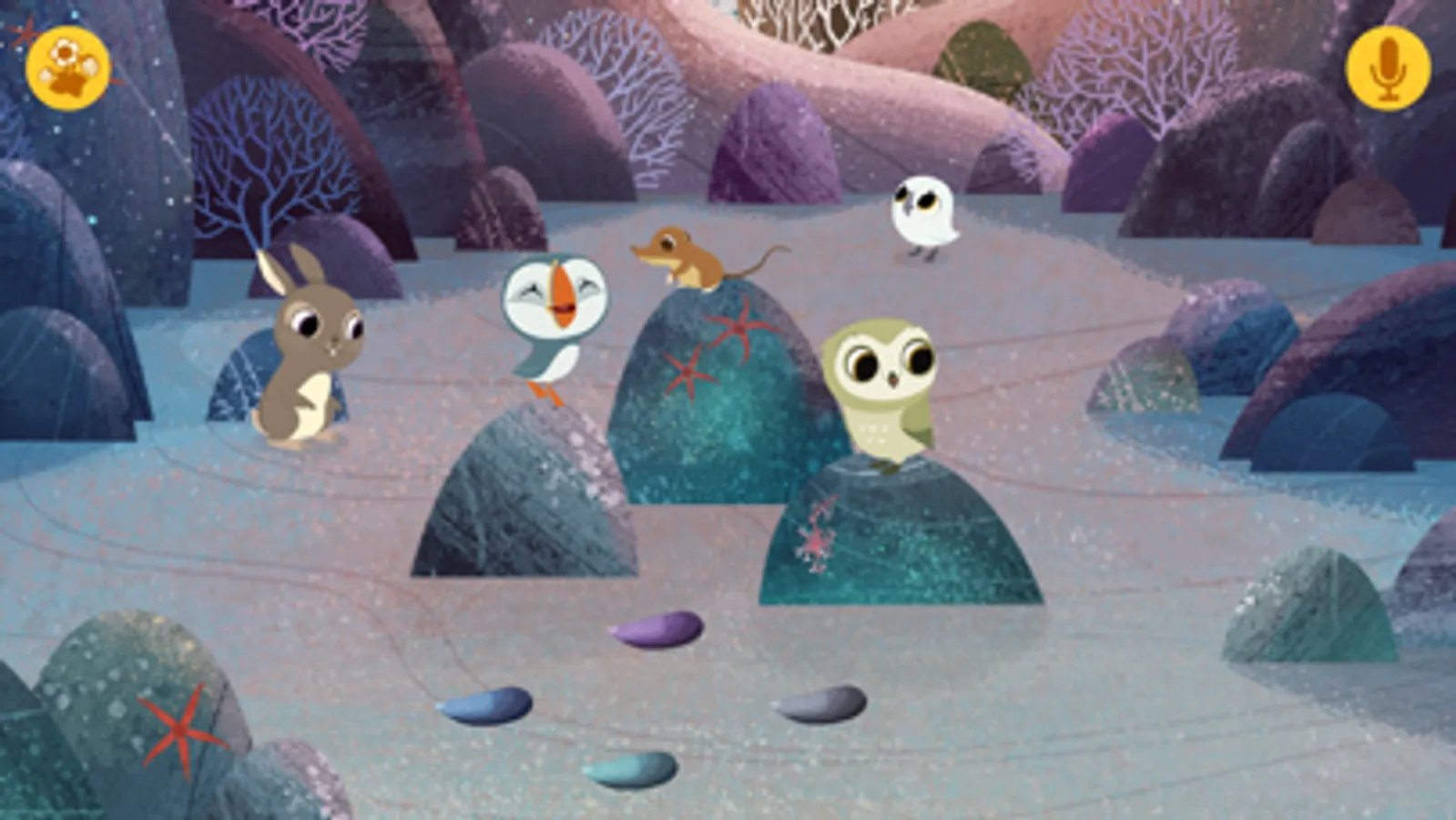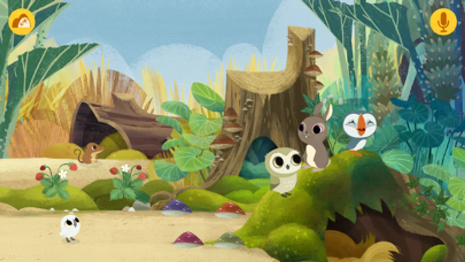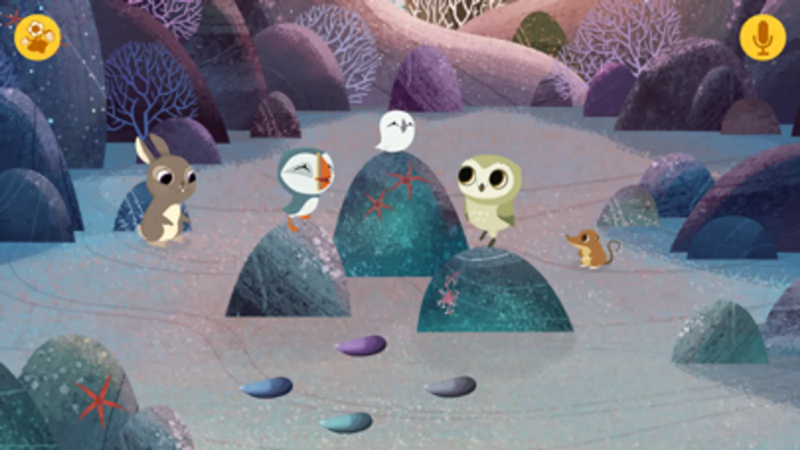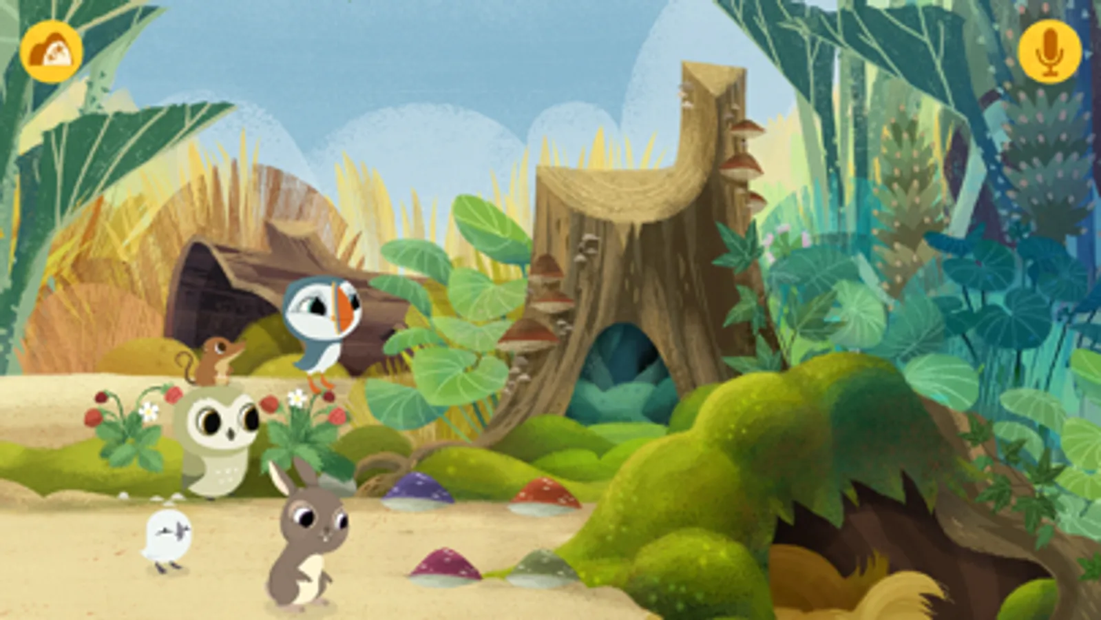 Experience the gorgeous music from the show, played by the Ulster Orchestra, and beautiful Puffin Rock animation. Through subtle movements, children can arrange their own Puffin Rock themes. Move a character onto a platform and hear their special music play, or tap a mushroom to bring in some percussion.