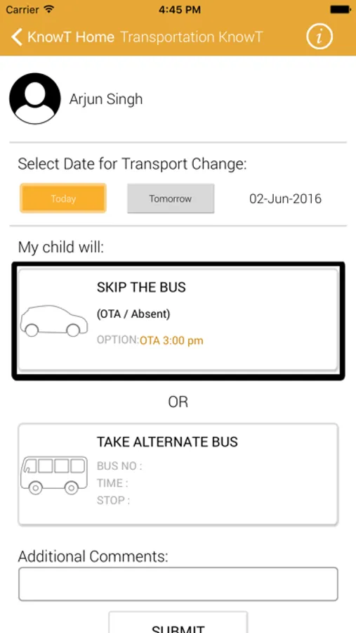 Thereafter, parents can send "KnowT"s to the school for various intimations like Transportation alteration, Leave or Absenteeism, Messages to be sent to specific staff member in the school, etc. Each such KnowT is processed in a defined workflow at the school's end, and parents get acknowledgements for each KnowT sent, thus ensuring no "loss in communication".