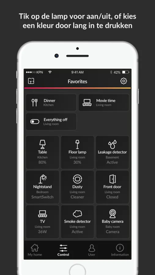 * Bedien de lamp vanaf je telefoon, je kunt deze dimmen en de kleurtemperatuur instellen (warm - koud wit)