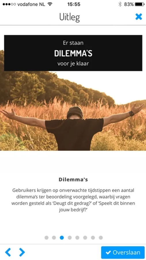 Gebruikers krijgen op onverwachte tijdstippen een aantal dilemma’s ter beoordeling voorgelegd, waarbij vragen worden gesteld als ‘Deugt dit gedrag?’ of ‘Speelt dit binnen jouw bedrijf?’.