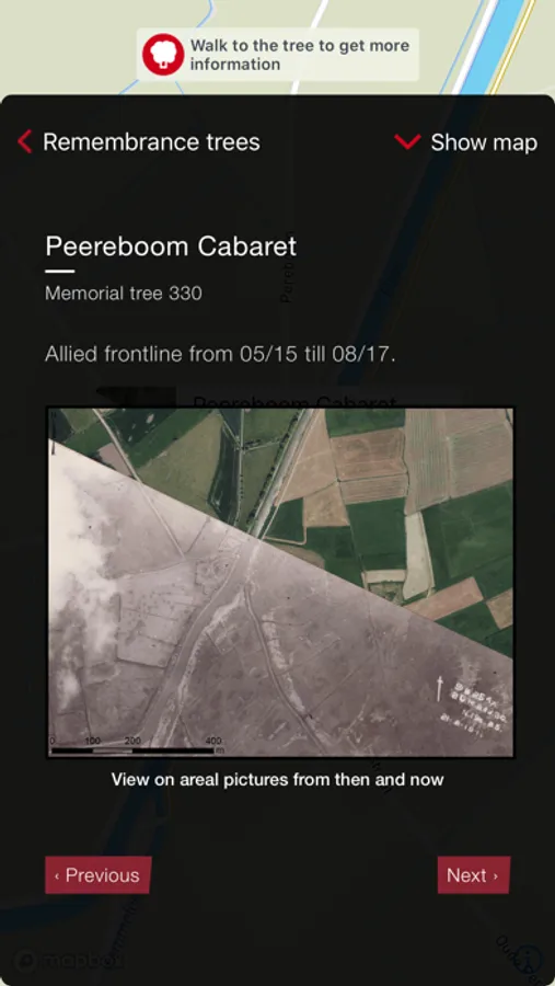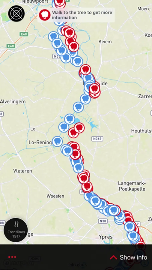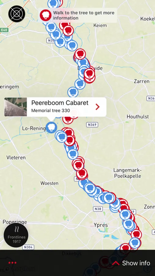 138 memorial trees, dotted across the Ypres Salient, mark the front line in the landscape. They pinpoint the location of the front in 1915–1917. The app helps you discover the memorial trees, and enjoy a view of `then and now’ through aerial photos.