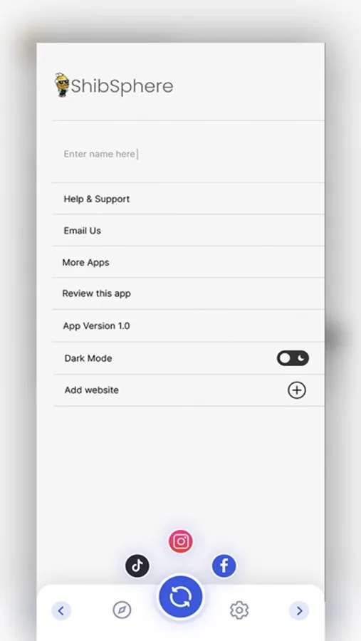 1. Tap on add button to add any website you’d like, then select any of you favorite social media & entertainment platforms that will be displayed in the tool bar, by tapping the wheel. Swipe between screens to navigate through apps & dashboard.