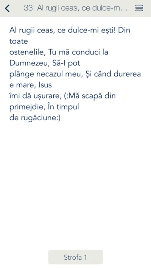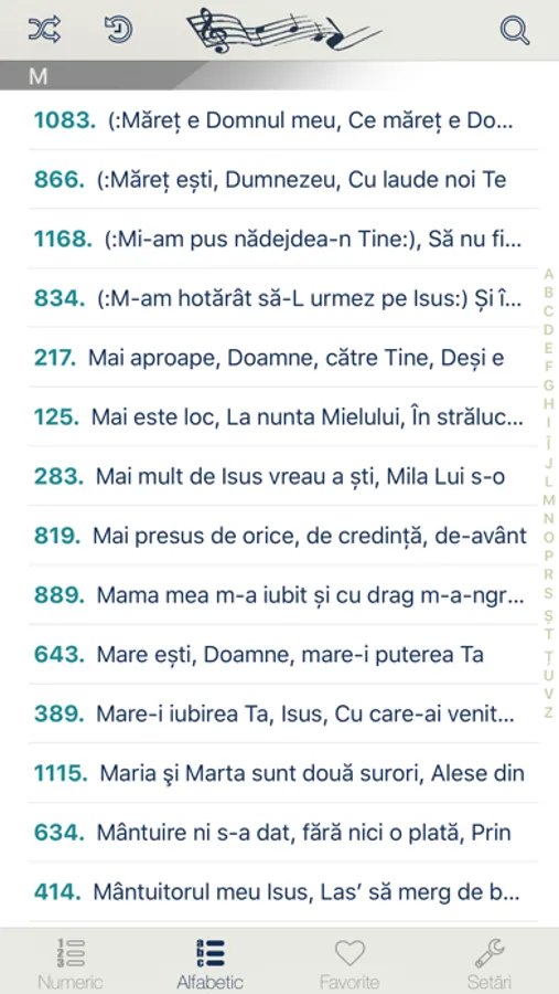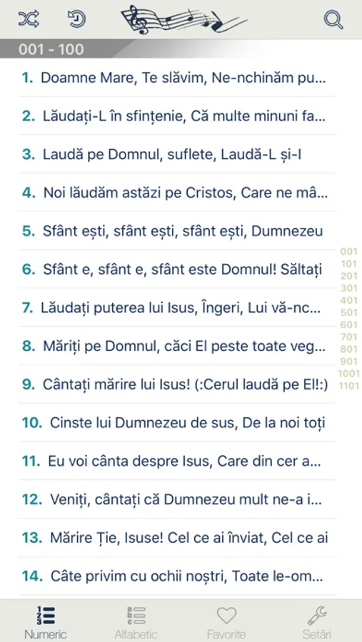 Aplicația conține textul complet al celor 1170 cântări, completat de tonalitate si tempo. Cântările pot fi ordonate Numeric, Alfabetic sau adăugate într-o listă separată ca Favorite. O cântare poate fi găsită rapid căutând după număr, titlu sau conținut (iOS 8) si afișată pe tot ecranul prin dublu-click.