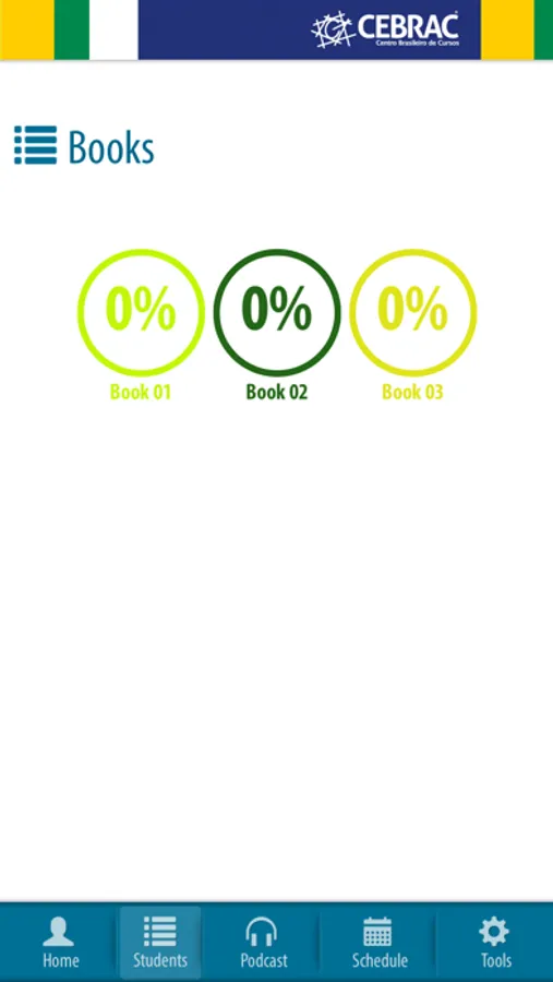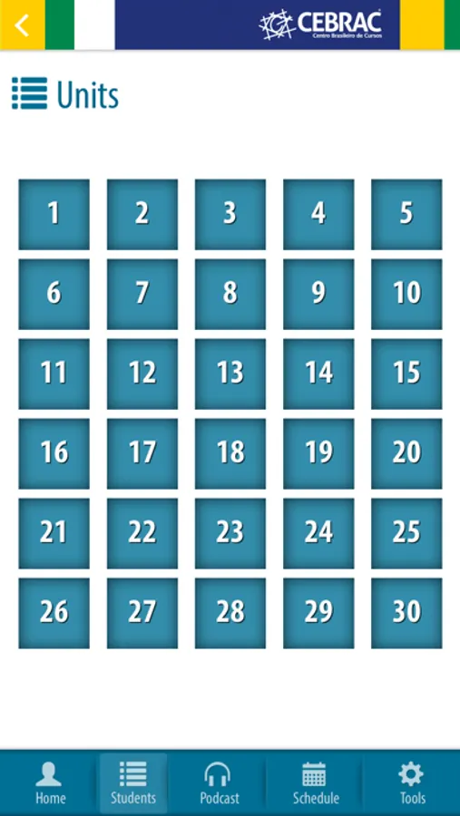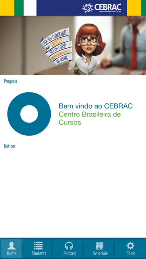 Aplicativo do curso CEBRAC English para uso dos alunos, contendo os áudios, podcasts e agenda de atividades.