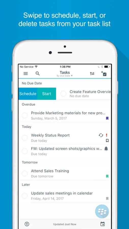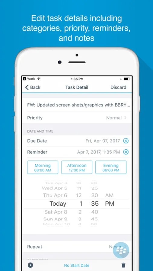 BlackBerry Tasks is an enterprise PIM application that allows you to create, edit, and manage tasks that are synchronized with Microsoft® Exchange.