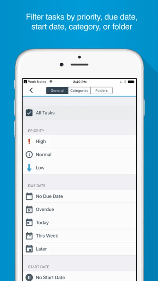 • Quickly view which tasks are overdue, due today, and due this week with a due date filter.