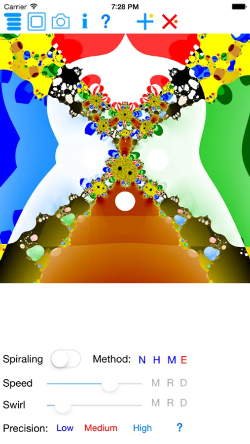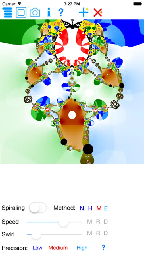 The app allows you to create abstract art-like images. You choose between a triangle, a circle and a rectangle as the basic shape, but the resulting image often looks much more sophisticated than the basic shape. Internally, the app uses fractal trap algorithm to count number of iterations falling within the basic shape. However, you don't need to know any mathematical details to produce intriguing images.