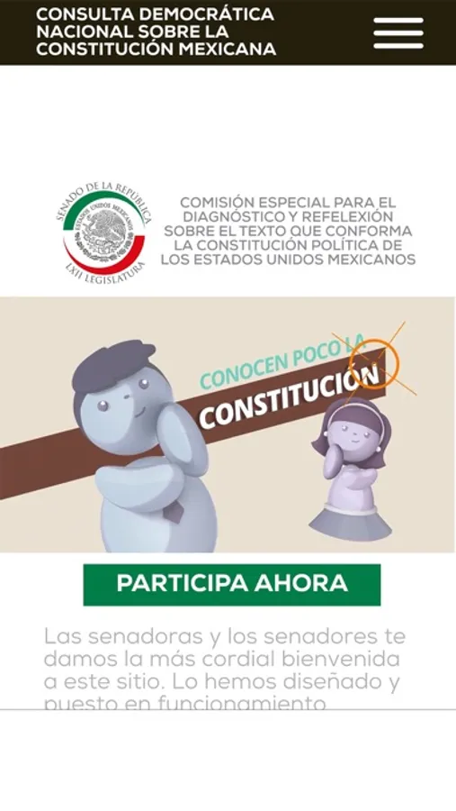 Las senadoras y los senadores te damos la más cordial bienvenida a esta aplicación. La hemos diseñado y puesto en funcionamiento pensando en ti y buscando tu participación.