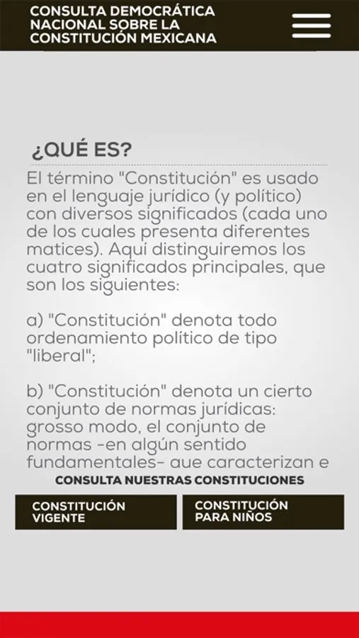 Por ese motivo estamos de fiesta y queremos que tú seas parte. Es sencillo y muy importante que te unas. ¿Cómo? Participando en la Consulta Democrática Nacional para que reflexiones y des tu opinión acerca de los valores, los derechos y deberes señalados en la Constitución. Puedes hacerlo respondiendo a un breve cuestionario o enviando un ensayo. Aquí te decimos cómo y te ofrecemos información para que conozcas mejor nuestra Ley Fundamental, así como algunas opiniones y reflexiones acerca de ella.
