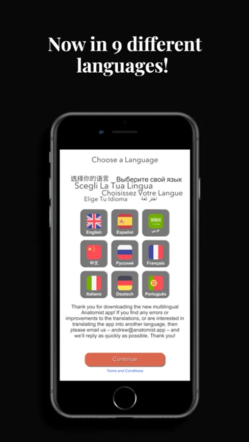 We're so proud to bring Anatomist – the best anatomy quiz app on the market – to 9 total languages now! If you'd like to see Anatomist in another language not yet available, please contact us and we'll see if we can add it!