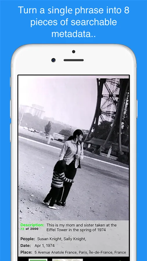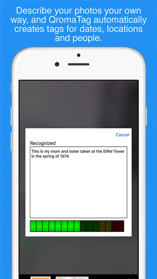 QromaTag creates and embeds industry standard photo metadata into your images using voice recognition. Make your photos searchable by telling us the date, location and people in your photos, and QromaTag creates industry standard EXIF and IPTC metadata tags. Import any JPEG image into QromaTag through iCloud Drive on your computer, or use the built in capture tool to scan in old photos. QromaTag’s powerful metadata tagging system will make your images searchable with any operating system or photo organization program that reads industry standard EXIF and IPTC metadata.