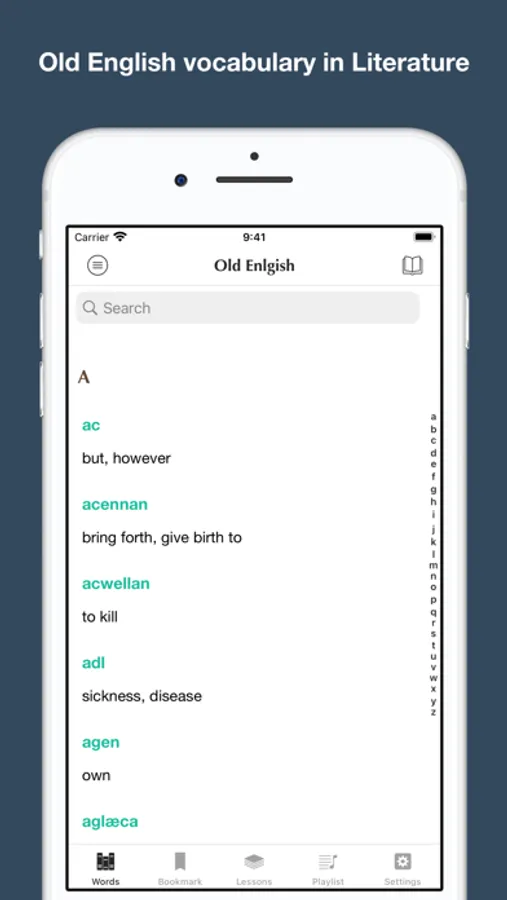 This app provides the digital tools and study material to help you learn over 500 old english words that commonly appeared in Old English literature