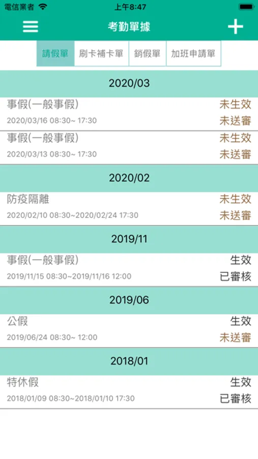 CHIAPP線上請假整合正航T8/T9/NBS ERP系統上的考勤資料,讓你隨時都能查詢個人考勤及出勤狀況,並能在上面新增請假單及刷卡補卡單。
