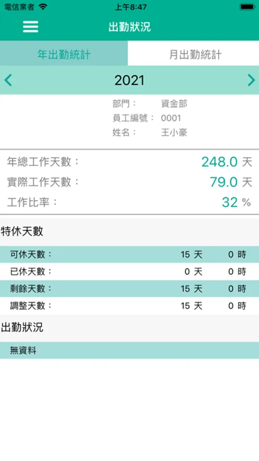 出勤狀況:查詢個人年度及各月出勤統計。