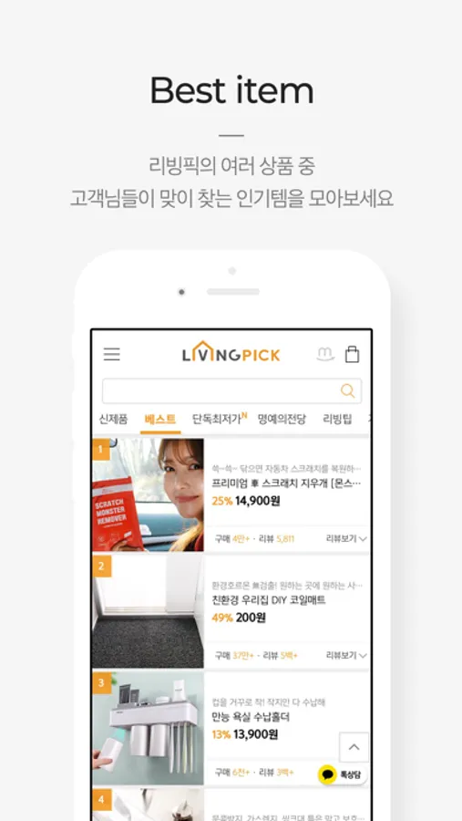구매했던 상품을 일일이 찾을 필요 없이 앱에 접속하면 자동으로 뜨는 간편리뷰 기능으로 편리함을 더했습니다.