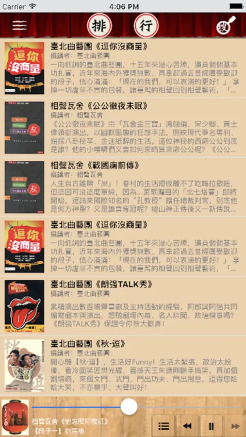 1.華人世界唯一擁有台灣4大說唱藝術團體的相聲演出內容,一口氣聽遍吳兆南、相聲瓦舍、台北曲藝團與漢霖說唱藝術團的經典段子,說學逗唱、爆笑連連!