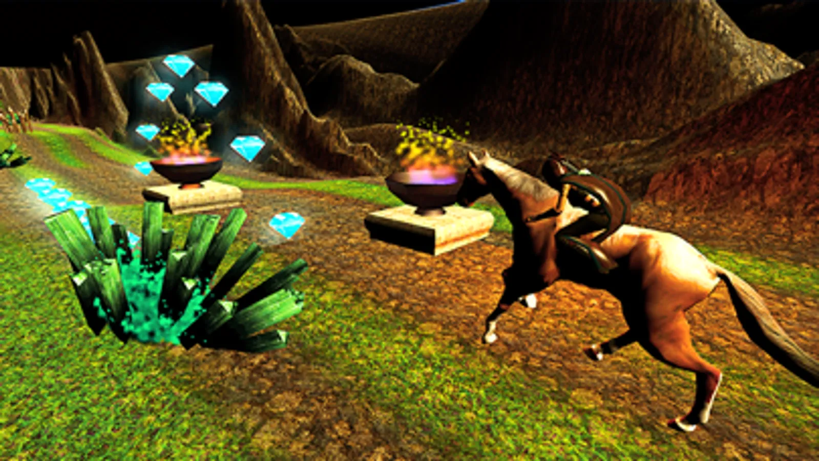 Challenging gameplay won’t be an easy task for you. A horse rider ghost chasing you with his heavy hammer is a scary scene. The path is full of sharp razor like hurdles, skeletons, grumpy rocks and many others. Amazing boost ups, diamonds & jewels will help your survive along. Interactivity of the environment, sound effect and gameplay is even more interesting to witness. The perfect skills of horse riding simulation in arcade style run will help you ride your wild horse to survive against the ghost run.
